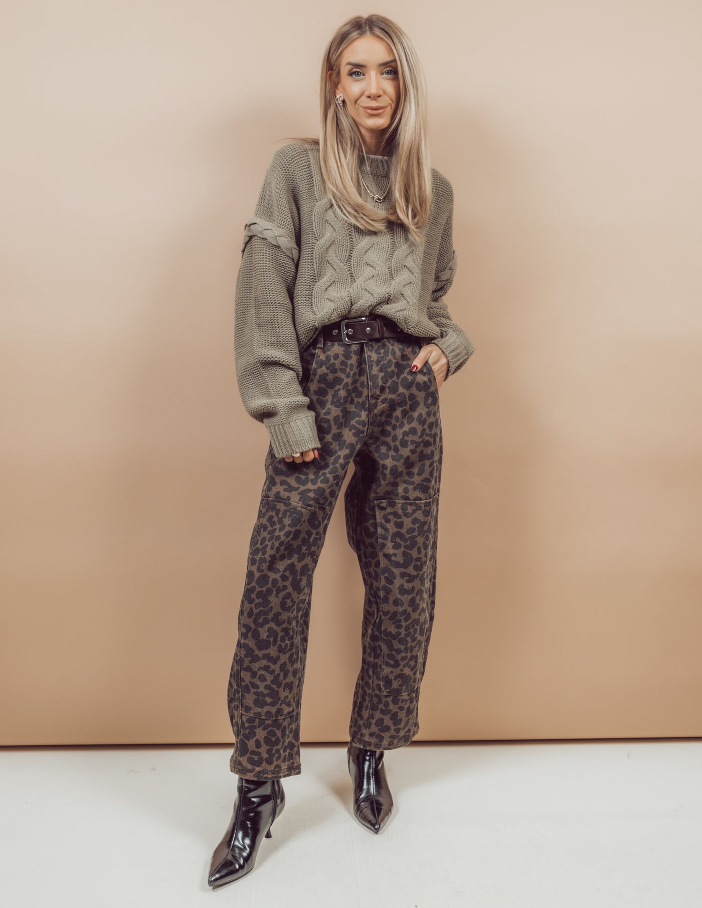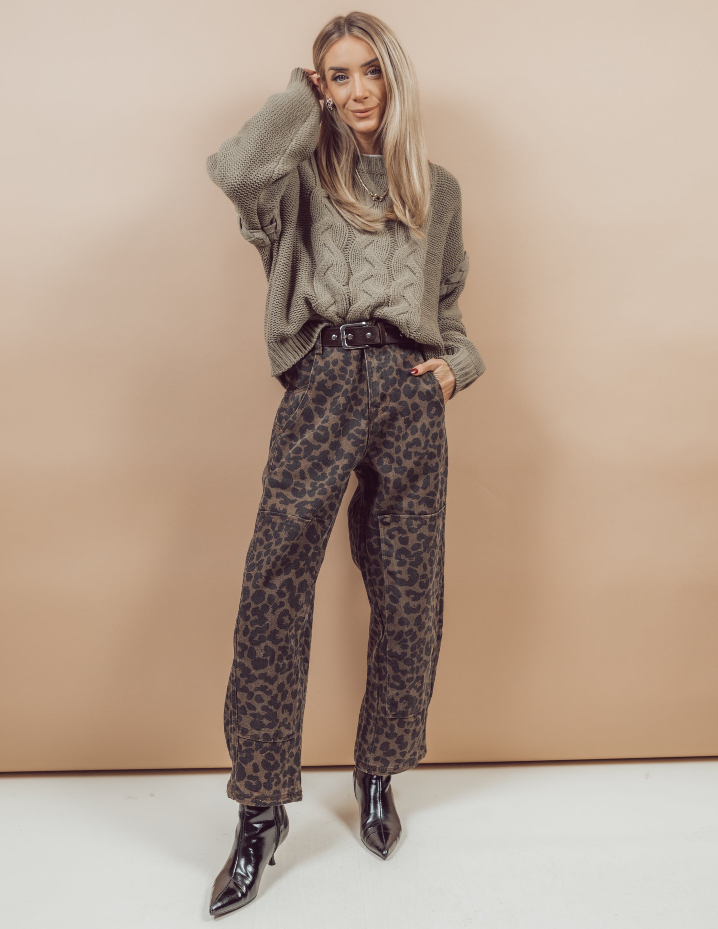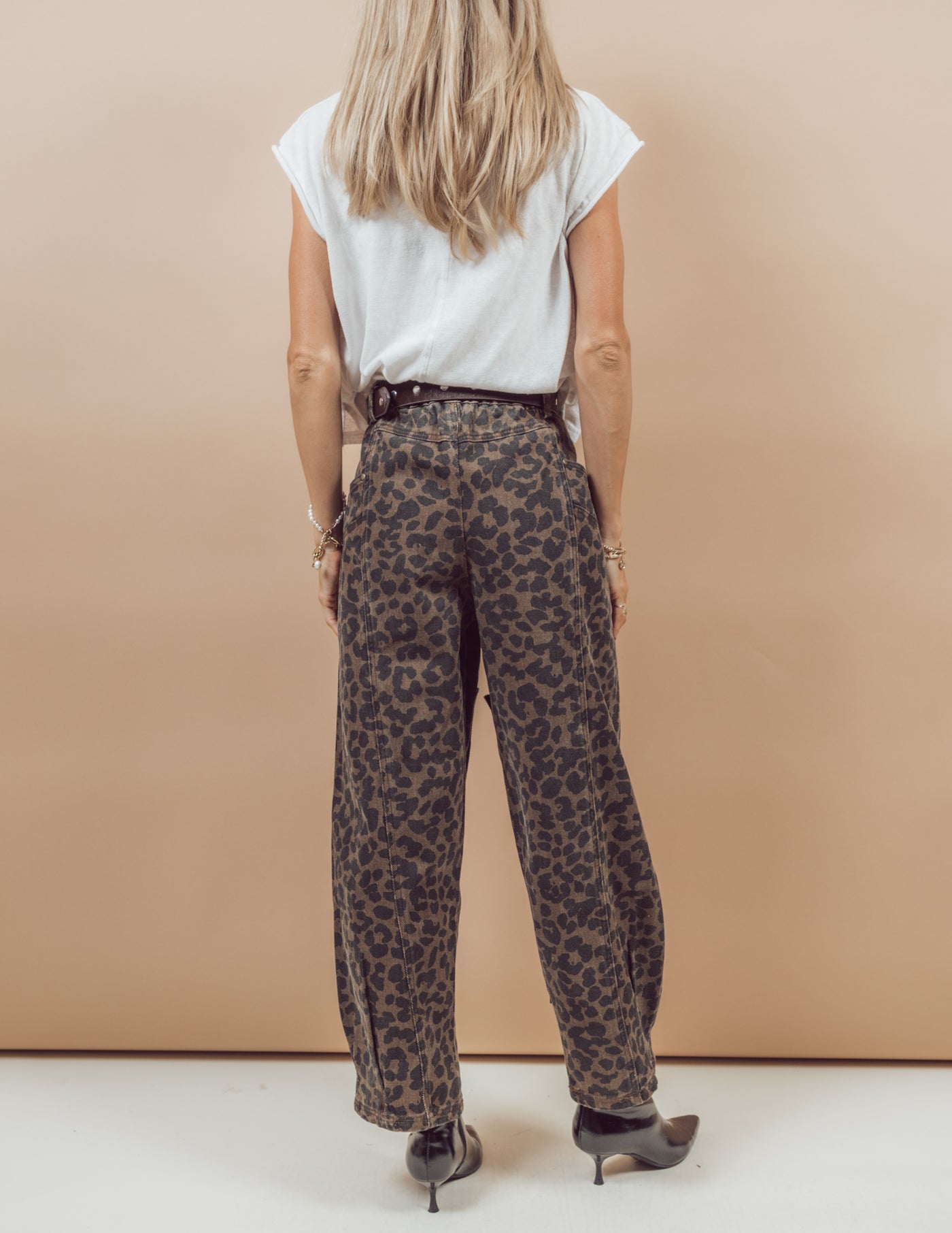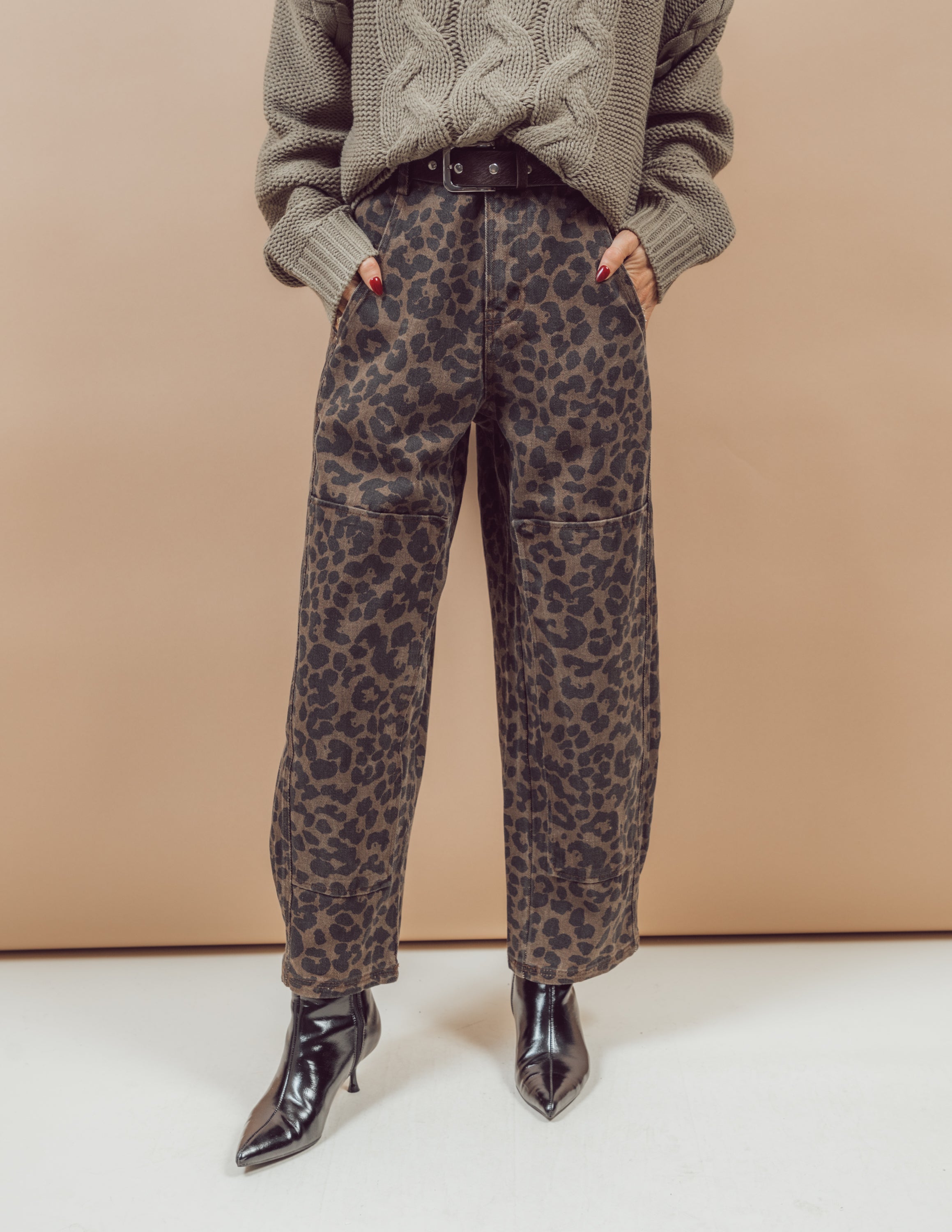 Introduce a sense of fun and style with our Vera Leopard Pants. Made with a trendy leopard print, these pants feature a mid-rise waist and a wide leg barrel shape to flatter your figure. Easily slip into these pants with a zipper and button closure, and enjoy the convenience of belt loops and side pockets that connect to both the front and back. The square patch details on the legs add a unique touch to this eye-catching piece.